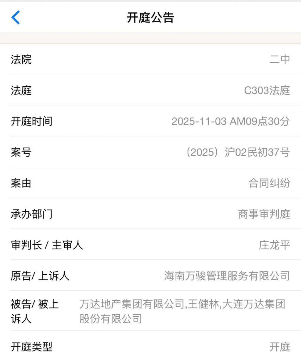 10月15日,据工商资料显示,近日,法院公开海南万骏管理服务有限公司起诉大连万达集团股份有限公司、万达地产集团有限公司、王健林合同纠纷案件开庭信息。公告显示,该案件计划于11月3日在上海市第二中级人民法院开庭审理。